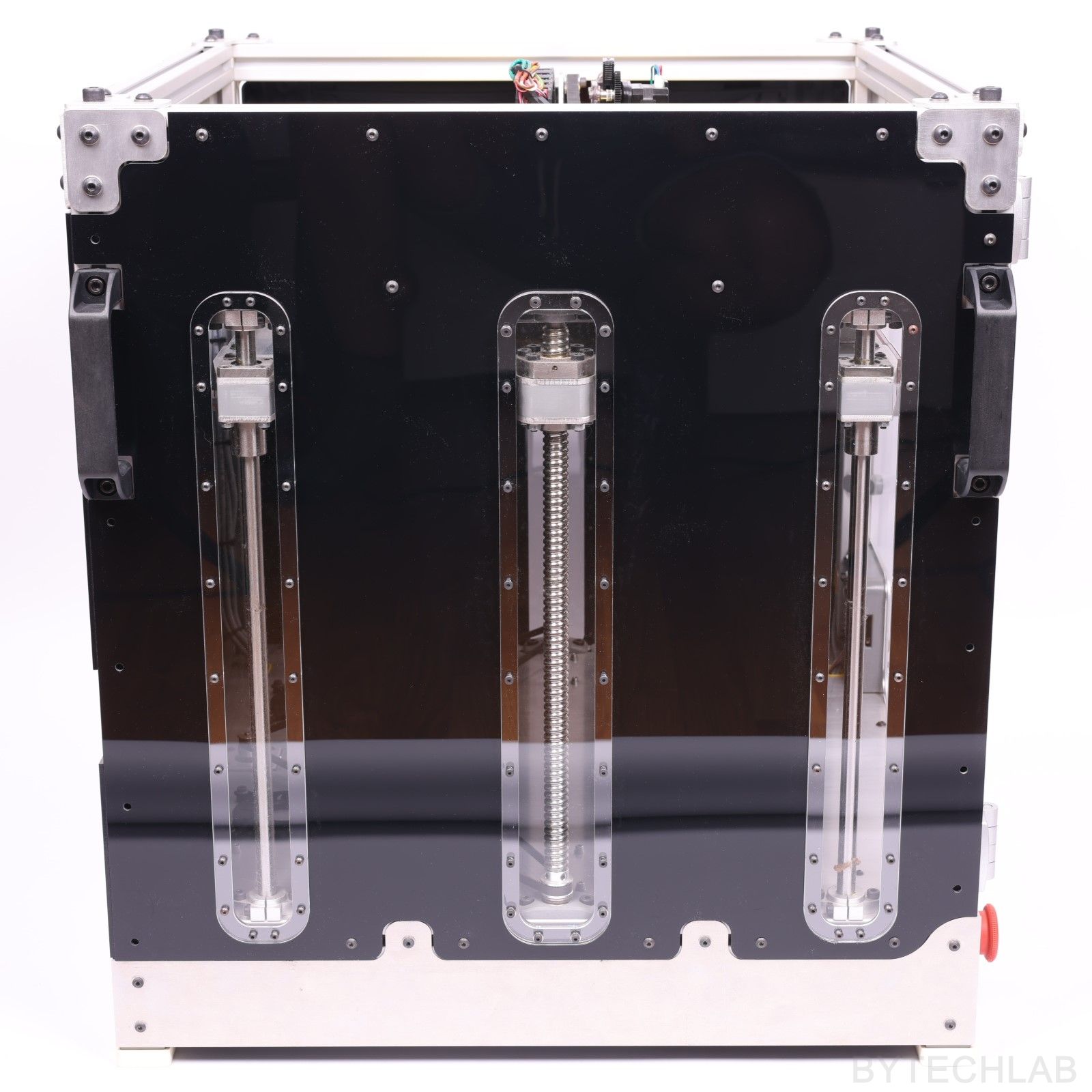 The whole Z-axis platform is very rigid. There is no chance to bend it with your hand. Due to its mass and inertia, it doesn’t vibrate at all. Vibrations on the Z-axis platform could potentially cause many defects on the 3D prints. Accuracy and repeatability of movement of the whole system is very good – I have made multiple tests with an dial indicator. Ball screws driven by a single belt are excellent – I will never use two or more stepper motors in this axis.